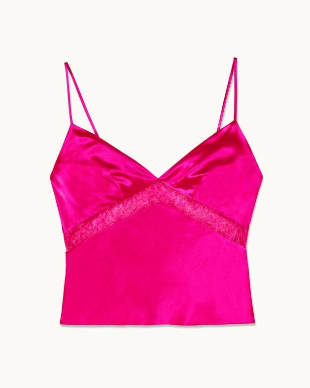 بلوزة ساتان حريري بأشرطة رفيعة قابلة للتعديل. يضفي خط العنق على شكل حرف V وتفاصيل الدانتيل لمسة من الأناقة. نسقيها مع بنطال مُفصّل أو تنورة واسعة لإطلالة أنيقة بكل سهولة.