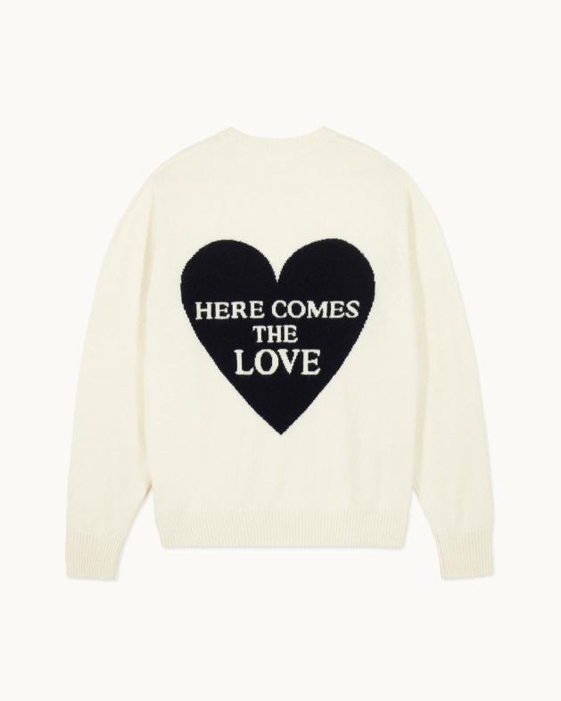 Bær dit hjerte på ærmet (eller sweateren) med denne hyggelige 2-trådet kashmirstrik. Med rund hals og lange ærmer har den et broderet hjerte og et markant "Her kommer kærligheden"-statement.