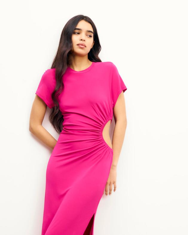 Udsmykket med en samlet udskæring i taljen, tager denne statement maxikjole dig fra dag til nat. Med en klassisk rund hals og korte ærmer afslører den en dristig sideslids for en iøjnefaldende silhuet.
