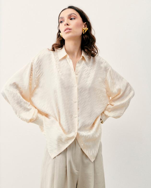 Fremtiden ser lys ud i denne jacquard-skjorte lavet af skinnende satinsilke. Med skjorteudskæring, lange ærmer, knaplukning og manchetter for en struktureret silhuet, kombiner den med skræddersyede bukser eller en flagrende nederdel.