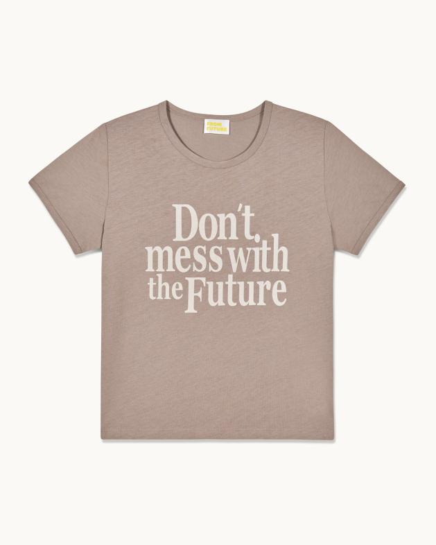 Elevate your seasonal wardrobe with our cotton tee featuring a bold "Don't mess with the Future" print. The crew neck and short sleeves make it a versatile piece that pairs perfectly with wide-leg jeans or tailored pants.