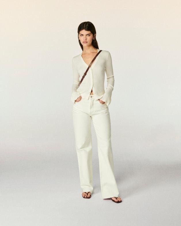 Széles szárú fazon, amely kiemeli futurisztikus alakodat. Ez a pamut farmer cipzáras és gombos záródással, öt zsebbel, „From Future” hímzéssel és nyers szegélyekkel rendelkezik. Válassz egy sikkes és laza megjelenést egy kényelmes pulóverrel és magassarkúval.