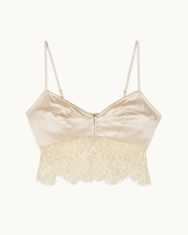 Ten top z satyny jedwabnej zdobiony jest koronkowymi brzegami. Dekolt w serek i cienkie ramiączka tworzą romantyczny look. Połącz go z pasującą spódnicą, aby stworzyć wyrafinowany zestaw.