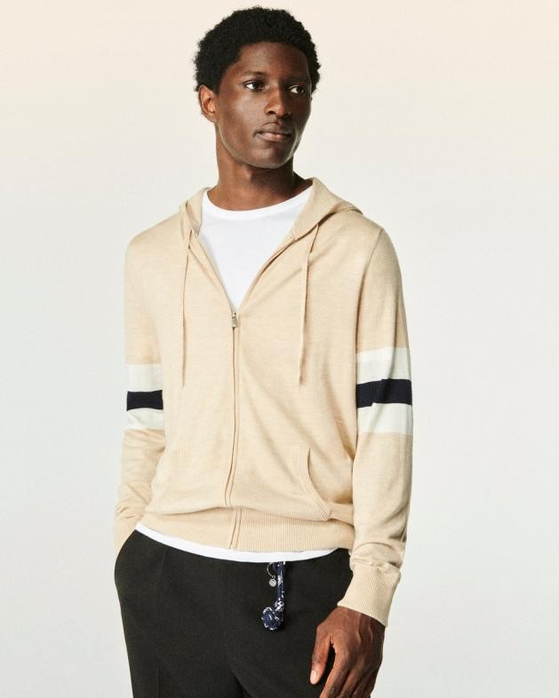 Ridică-ți stilul la noi culmi cu acest hanorac din lână Merino extrafină. Împodobit cu dungi contrastante, are o glugă cu șnur, închidere cu fermoar, mâneci lungi, două buzunare și margini cu nervuri. Ușor de combinat și asortat, completează-ți ținuta asortând-o cu blugi casual.