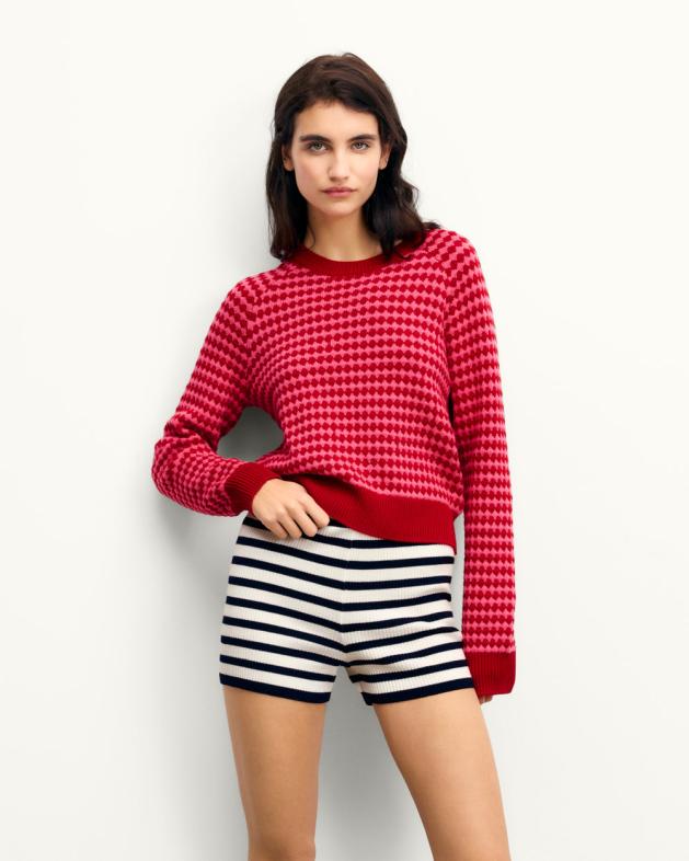 Confecționat dintr-un amestec moale de bumbac și cașmir cu 4 straturi, acest pulover scurt este împodobit cu modele geometrice pentru un aspect îndrăzneț și vibrant. Are un guler rotund clasic și mâneci lungi.