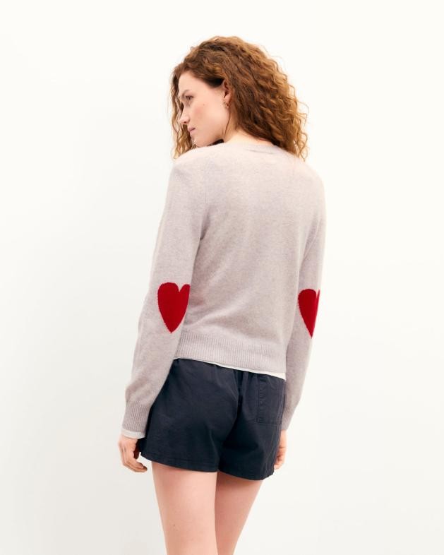 O abordare romantică a unei piese atemporale. Acest pulover scurt este împodobit cu inimioare roșii fermecătoare pe coate. Fabricat din cașmir cu două straturi, are guler rotund, mâneci lungi și margini cu nervuri. Asortează-l cu o fustă lejeră pentru un ansamblu elegant.