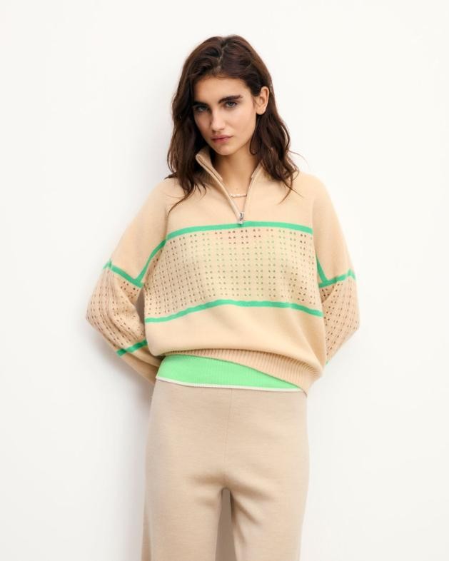 Tento nadrozmerný sveter vyrobený zo 4-vrstvového kašmíru je ozdobený kontrastnými pásmi a jemnými prelamovanými detailmi. Pohodlný štvrťzipsový výstrih dodáva teplo a pohodlie. Skombinujte ho so širokými džínsami alebo nohavicami na mieru.